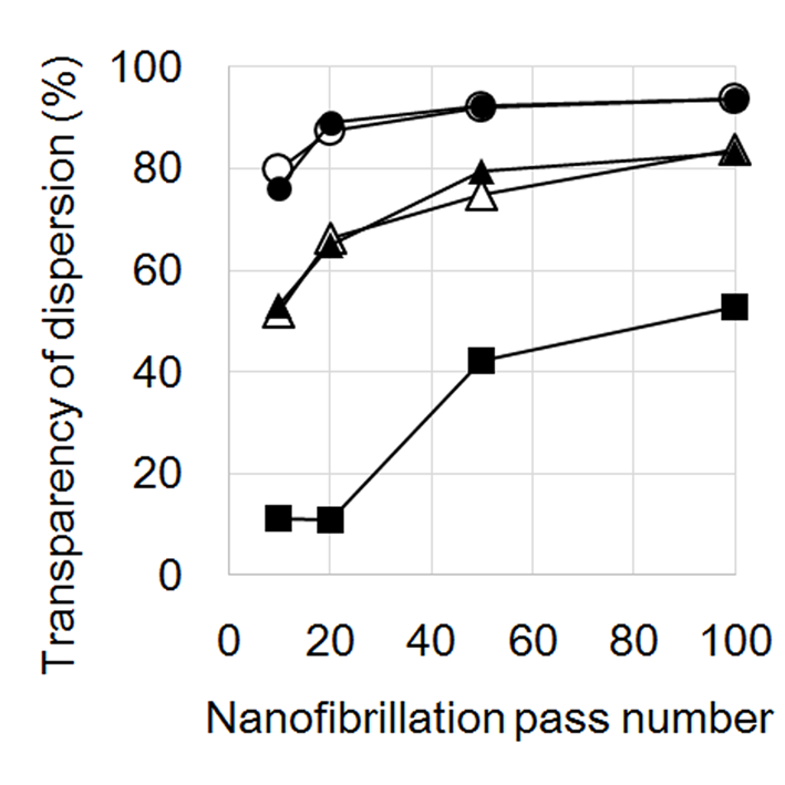 高純度セルロースウェットパルプは、木材繊維からリグニンとヘミセルロースのほとんどを除去し、その後、乾燥することなく湿潤状態を保ったパルプである。このようにセルロース純度を高めると、パルプ中のセルロースナノファイバー同士が凝集するため単離が困難になり、機械的解繊処理を100回行っても、懸濁液透過率は80%に留まった(Fig. 2 ▲, △)。なお、針葉樹と広葉樹由来の懸濁液は、ほぼ同じ傾向を示した。
